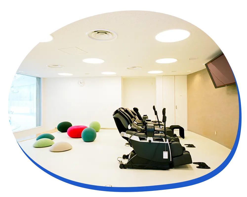 備え付けのマッサージ機でリフレッシュも可能です。プールゾーンを一望できる空間です。ご利用の合間の待ち時間にも快適にお過ごしいただけます。