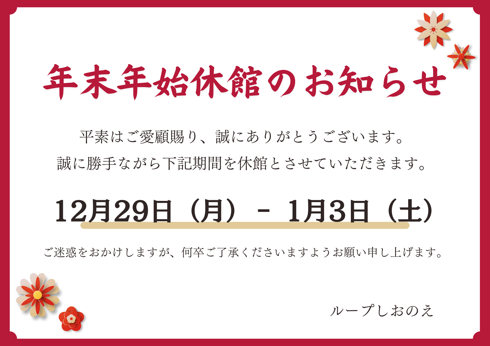 年末年始休館日 12月29日~1月3日