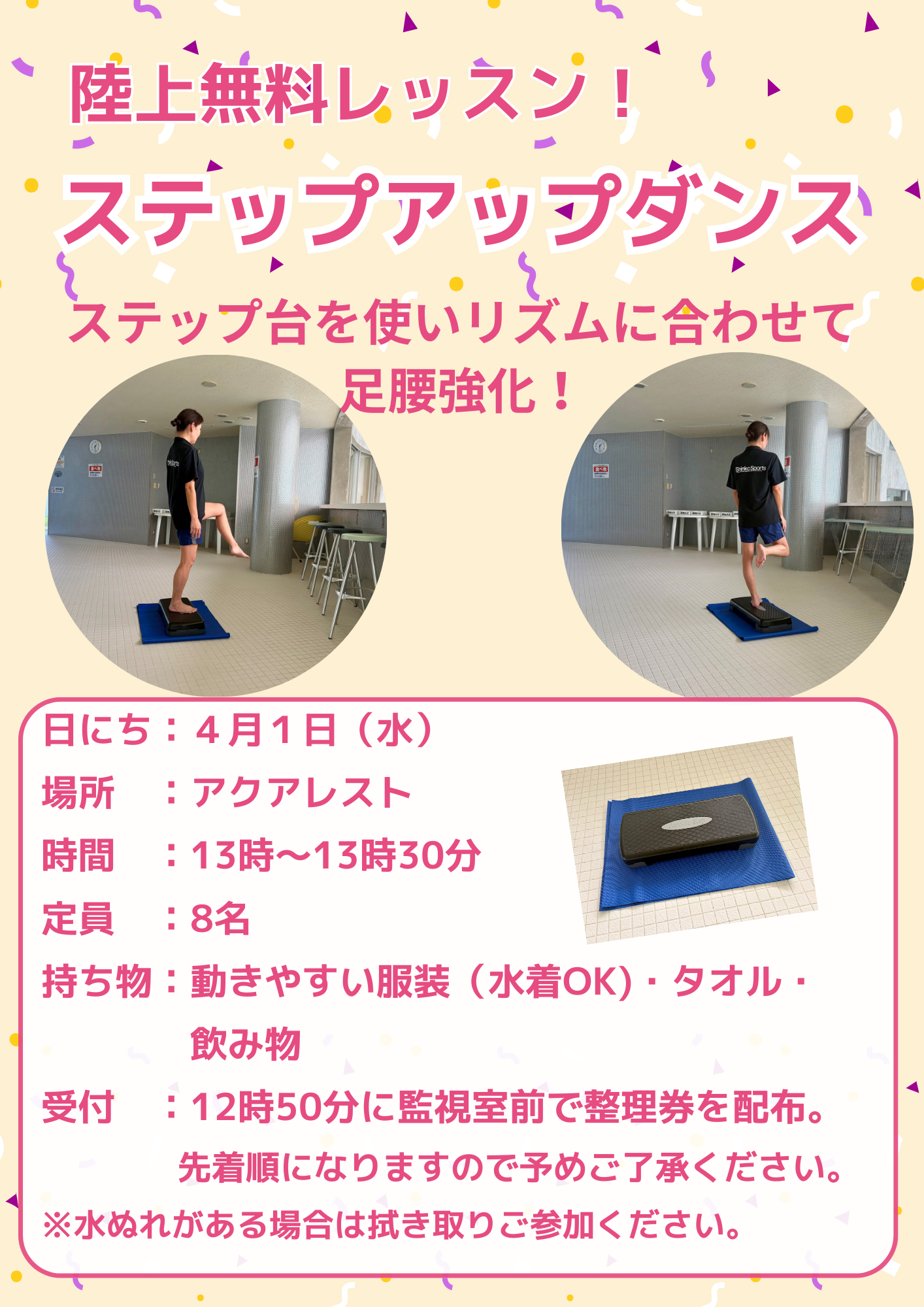 | 水中レッスン&陸上レッスン | 水 | 13:00~13:45 | 水中や陸上で色々なレッスンを実施 ※レッスン日程・内容はこちら |