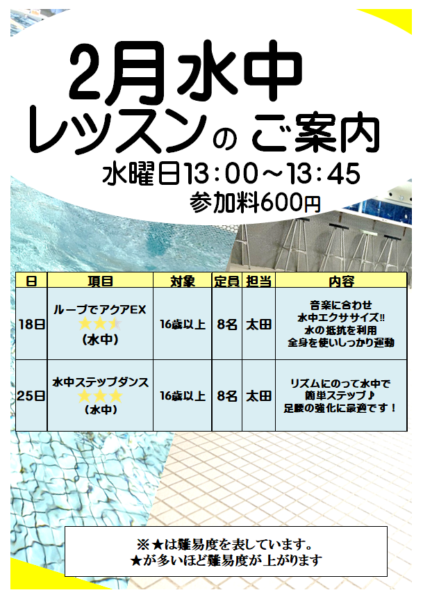 | 45分600円水泳レッスン(当日、レッスン券をご購入のうえ、受付にてお申込み下さい) 【定員】8名 | |||||||||