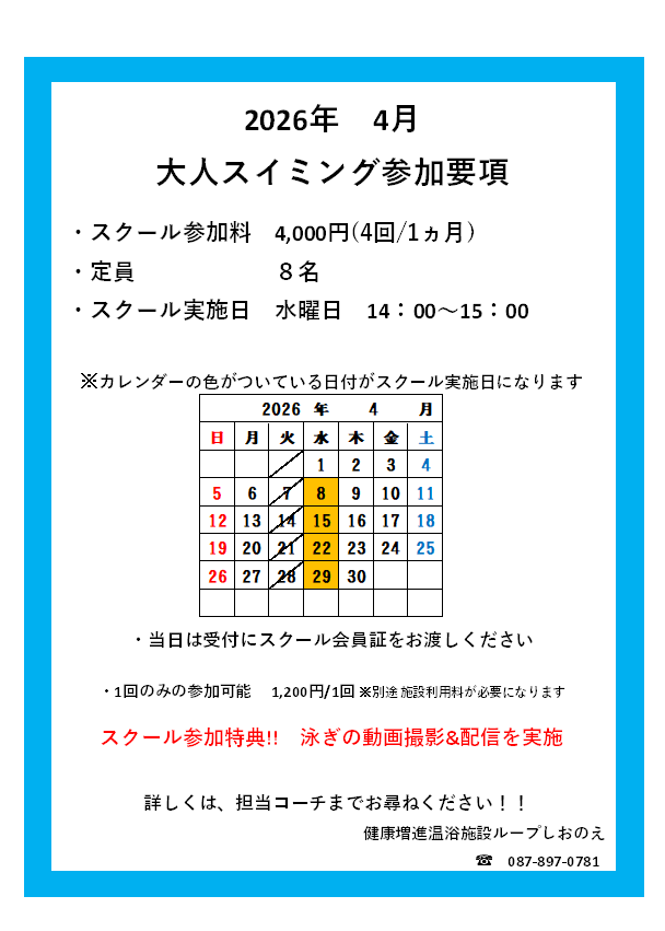2026年4月度 大人スイミング参加要項