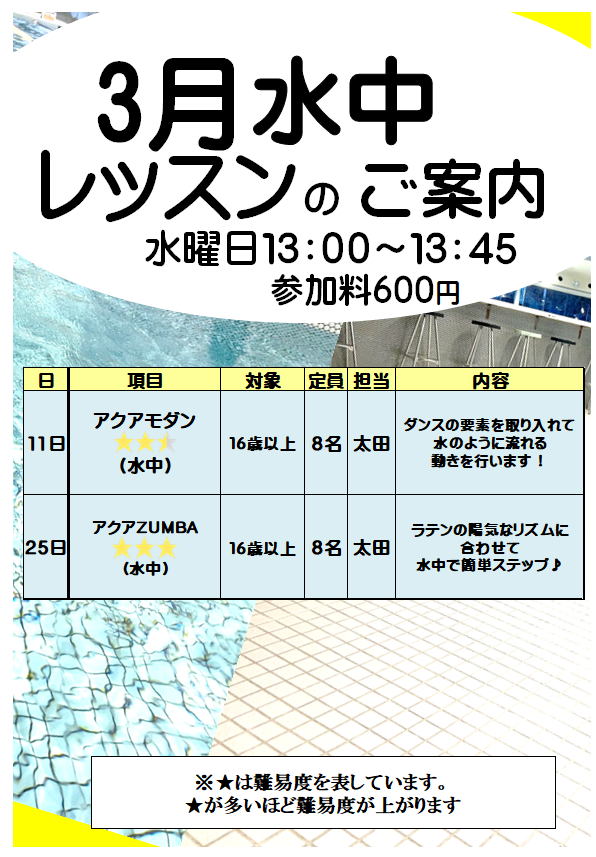 | 45分600円水泳レッスン(当日、レッスン券をご購入のうえ、受付にてお申込み下さい) 【定員】8名 | |||||||||